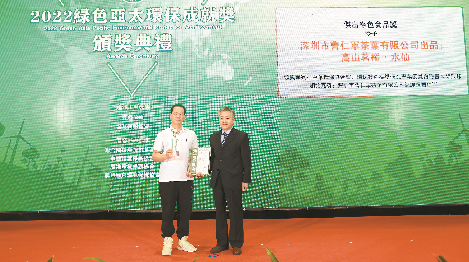 2023年2月23日,「綠色亞太2022環保成就獎」頒獎典禮在深圳好日子皇冠假日酒店盛大舉行。本次評獎活動由聯合國環境規劃基金會、中國環境保護協會、香港環境保護協會、澳門綠色環境保護協會聯合主辦;由香港商報承辦。深圳市曹仁軍茶葉有限公司出品的北苑貢茶「高山茗樅·水仙」喜獲「綠色亞太2022環保成就獎(傑出綠色食品獎)」的殊榮,這也是該公司繼2019年以來,第二次獲得此項榮譽。