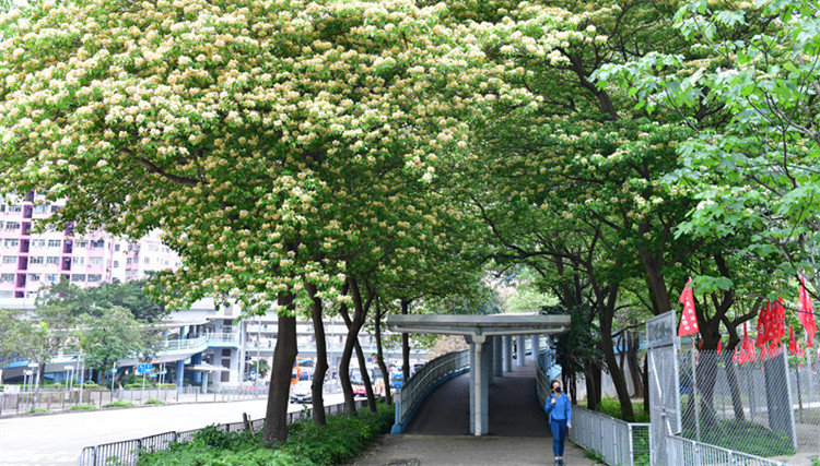 今天是復活節公眾假期最後一天,市民繼續懷着好心情欣賞美景美樹。由旺角通向大角咀奧海城的行人天橋兩旁,大棵的魚木樹近日正在盛放開花,一朵朵淡黃、素白色的魚木花茂密綻放,形成密密的花海。