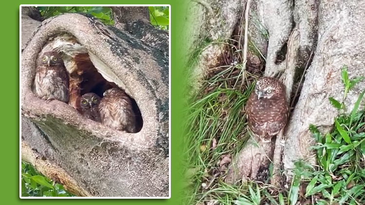 粉嶺高爾夫球場(粉嶺球場)生機盎然。今日(15日),有香港哥爾夫球會員工在舊球場4號洞發現一窩貓頭鷹,其中3隻窩在樹洞的鷹巢中,悠然自得,另外2隻就倚在同一棵大樹的根部,看着正持手機拍攝的員工,十分精靈,也不害怕人類靠近。