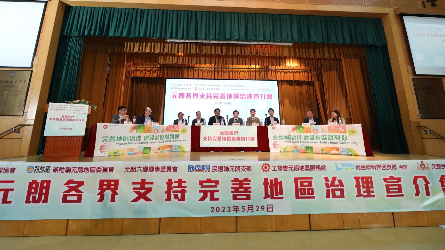 5月29日,為向元朗各界社區團體及元朗三會成員更清晰解說政府推出完善地區治理方案的精髓,更深層地推動基層社區工作的發展建設,元朗各界協會、新社聯元朗地區委員會、元朗六鄉鄉事委員會、民建聯元朗支部、工聯會元朗地區服務處及經民聯新界西支部合辦,元朗民政事務處協辦,舉行「元朗各界支持完善地區治理宣介會」。活動有128個地區團體及同鄉社團參與,在元朗香島中學2樓禮堂隆重舉行,超過500名來自元朗市、天水圍及元朗鄉郊區的社團領袖及三會成員出席,盛況空前。