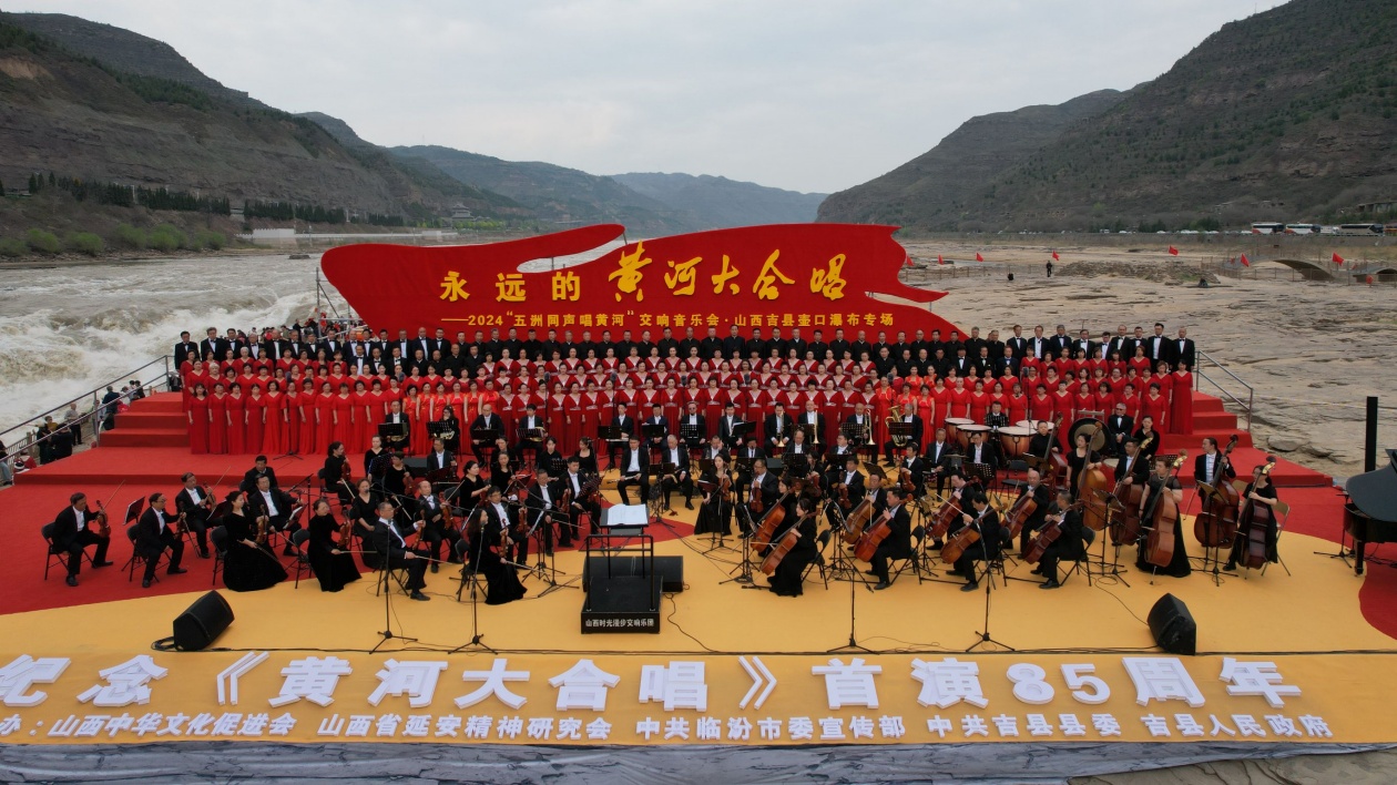 4月10日,紀念《黃河大合唱》首演85周年·永遠的黃河大合唱——2024年 「五洲同聲唱黃河」交響音樂會在吉縣壺口瀑布岸畔震撼開唱,兩岸同胞、海外僑胞首次歷史性共同演唱氣勢磅礴、激情昂揚的《黃河大合唱》完整作品,用歌聲傳承紅色經典、賡續紅色血脈,用歌聲傳遞中華民族堅不可摧的精神和力量。