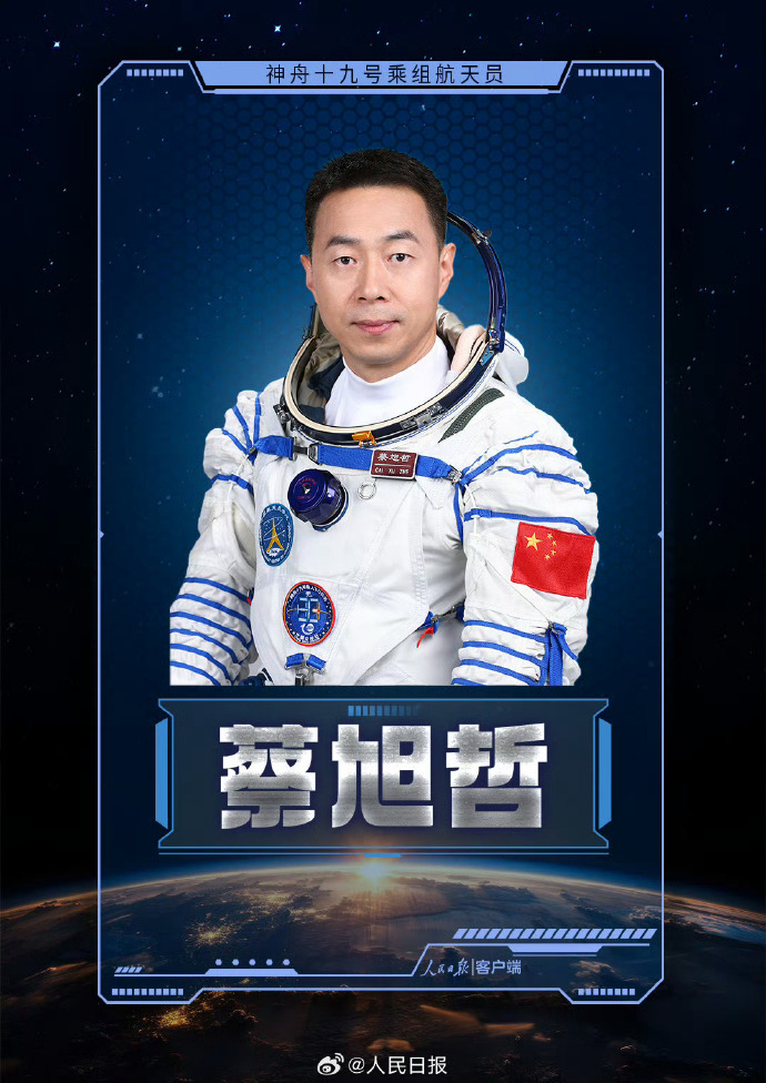 據中國載人航天工程辦公室消息,經任務總指揮部決定,執行神舟十九號載人飛行任務的航天員乘組由蔡旭哲、宋令東、王浩澤3名航天員組成,蔡旭哲擔任指令長。航天員蔡旭哲執行過神舟十四號載人飛行任務;宋令東和王浩澤均為我國第三批航天員,兩人都是「90後」,都是首次執行飛行任務。