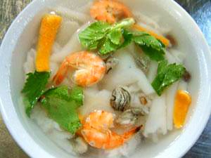 泡發暢幹,洗淨;丁香魚幹除去雜質;泡發香菇,洗淨,切條;蔥、蒜洗淨切段,起油鍋編熟。制糊。大鍋內加清水1000克,用大火燒至七成熱時,在鍋的內邊抹勻一圈花生油後,舀米漿一碗(約800克)由左向右沿鍋邊澆一圈,將鍋蓋嚴,悶片刻後揭蓋,見鍋邊的米漿烙熟起卷時,用鍋鏟將米漿鏟火鍋內。此時鍋內再加水500克,依此法分數次將米漿繞澆完畢。鍋內放入蝦糠、蝦油、和其他輔料一起煮熟,調准口味,裝碗即成。