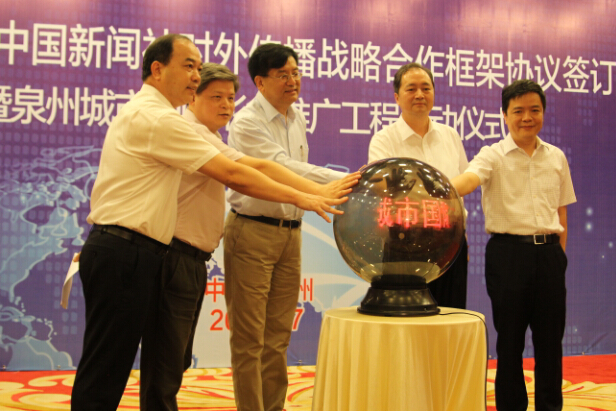 【香港商報網訊】記者田琴、李昌杰報道:5日,泉州與中新社戰略合作簽約暨泉州城市國際形象推廣工程啟動儀式在泉州舉行。中國新聞社社長章新新與中共泉州市委書記、市長鄭新聰簽署《建立對外傳播戰略合作關系框架協議》。當天,章新新、鄭新聰與中新社福建分社社長徐德金、中共泉州市委秘書長翁祖根、中共泉州市委宣傳部長陳慶宗共同啟動泉州城市國際形象推廣工程。