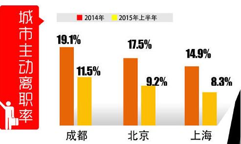 成都工資漲得快是有目共睹的,不過另一組數據還是在提醒成都,在工資問題上要“戒驕戒躁、更進一步”。報告顯示,在過去兩年中,成都的主動離職率一直處於整體平均水平以上,穩定地領先於工資水平最高的“帝都”和“魔都”。