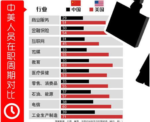 中國人有多愛跳槽?領英發布的報告顯示,中國上班族的平均在職時間為34個月,相比美國的56個月,幾乎短了兩年。據了解,互聯網是“歪果仁”平均在職時間最短的行業,但一般還是會在互聯網工作將近48個月才跳槽;而中國最不愛跳槽的制造行業,也能保持39個月的新鮮感。