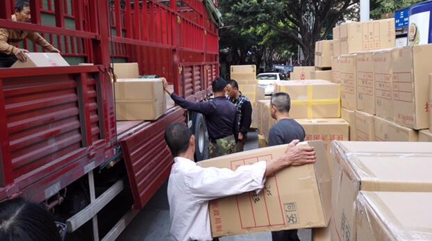 昨日上午,記者在同安慈善會辦公地址看到,裝衣被的箱子印有“扶貧濟困送溫暖”字樣,規格約為75cm*60cm*45cm,300箱把整個儲存室堆得滿滿當當。工作人員們快速有序地將經整理、消毒、檢驗檢疫,并包裝好的愛心衣被,從儲存室里一箱一箱搬到路邊,然后放到解放牌高欄車上。