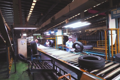 莆田佳通轮胎公司积极开拓出口市场,目前轮胎产品销路已延伸到“一带一路”沿线的30多个国家和地区。2016年实现向这些国家和地区的销售额超2亿元,今年前4个月又实现较大幅度的增长。图为19日,公司工作人员正在检查轮胎质量。