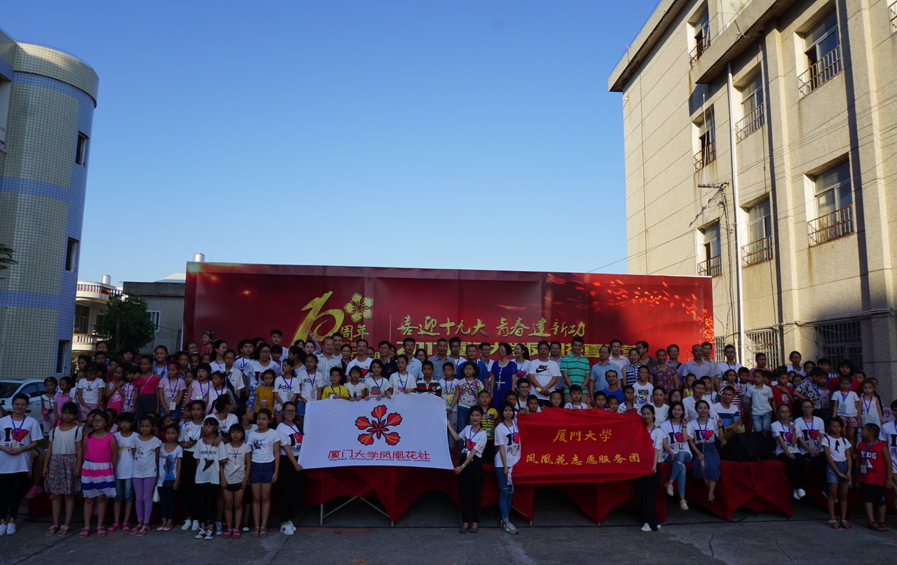 【香港商報網訊】記者胡薇報道:21日天下午,2017年廈門大學鳳凰花夏令營開營儀式暨十周年慶典在珩厝小學舉行。翔安區教育局副局長許海建、翔安區團區委副書記陳明、新店鎮團委書記許小樹、珩庴小學校長吳志雄、廈門大學翔安校區黨工委副書記、管委會副主任高忠華,廈門大學研究生院綜合辦副主任羅春霞、廈門大學校辦副主任、翔安校區辦主任劉立榮,廈門大學學生處副處長、翔安校區學生辦主任張清榕,廈門大學翔安校區團工委書記洪海松,廈門大學鳳凰花志願服務團領隊、鳳凰花社創社社長詹偉峰、以及曆屆鳳凰志願服務團指導老師和志願者代表共同出席。