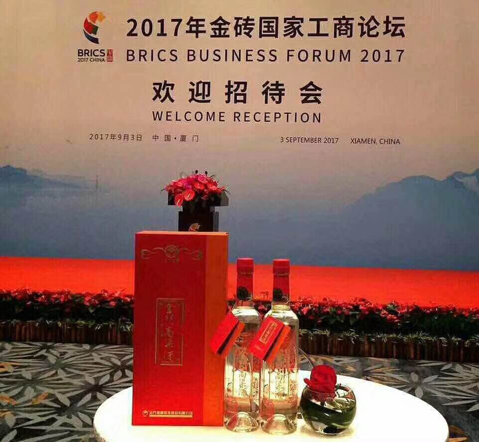 据了解,金门高粱被「2017金砖国家领导人会晤」纳为招待用酒,金门酒厂总经理谢世杰介绍,此次金砖会晤的指定酒品,甄选的是2016、2017年度连续荣获国际赛事双金牌奖的----金门高粱精醇佳酿0.5L-56度金酒典藏珍品礼盒。此款酒品以窖藏多年的优质陈年酒基, 依照古法「三高二低一翻」独特固态发酵酿造工艺,经坑道温润窖藏,风味独特。在造型设计上,酒品突出中国红元素,结合赤红龙纹图腾,彰显大中华特色,以喜庆大气的色彩,向第九届金砖峰会献礼。