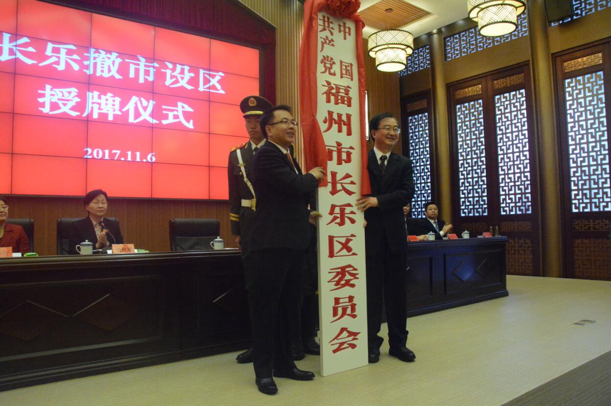 2017年11月6日上午,長樂撤市設區授牌儀式在長樂市委勤政堂舉行,福建省委常委、福州市委書記王寧,福州市市長尤猛軍,省民政廳廳長池秋娜等領導出席。由福州市四套班子主要領導、紀委書記分別對長樂區委、區人大、區政府、區政協、區紀委依次進行授牌。