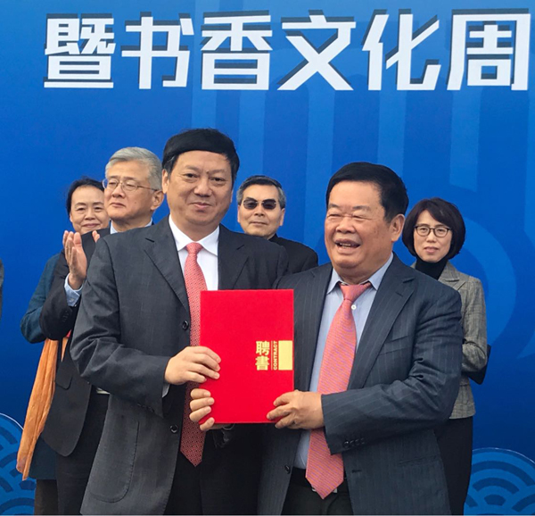 尤猛军市长代表市政府向曹德旺颁发终身荣誉馆长聘书
