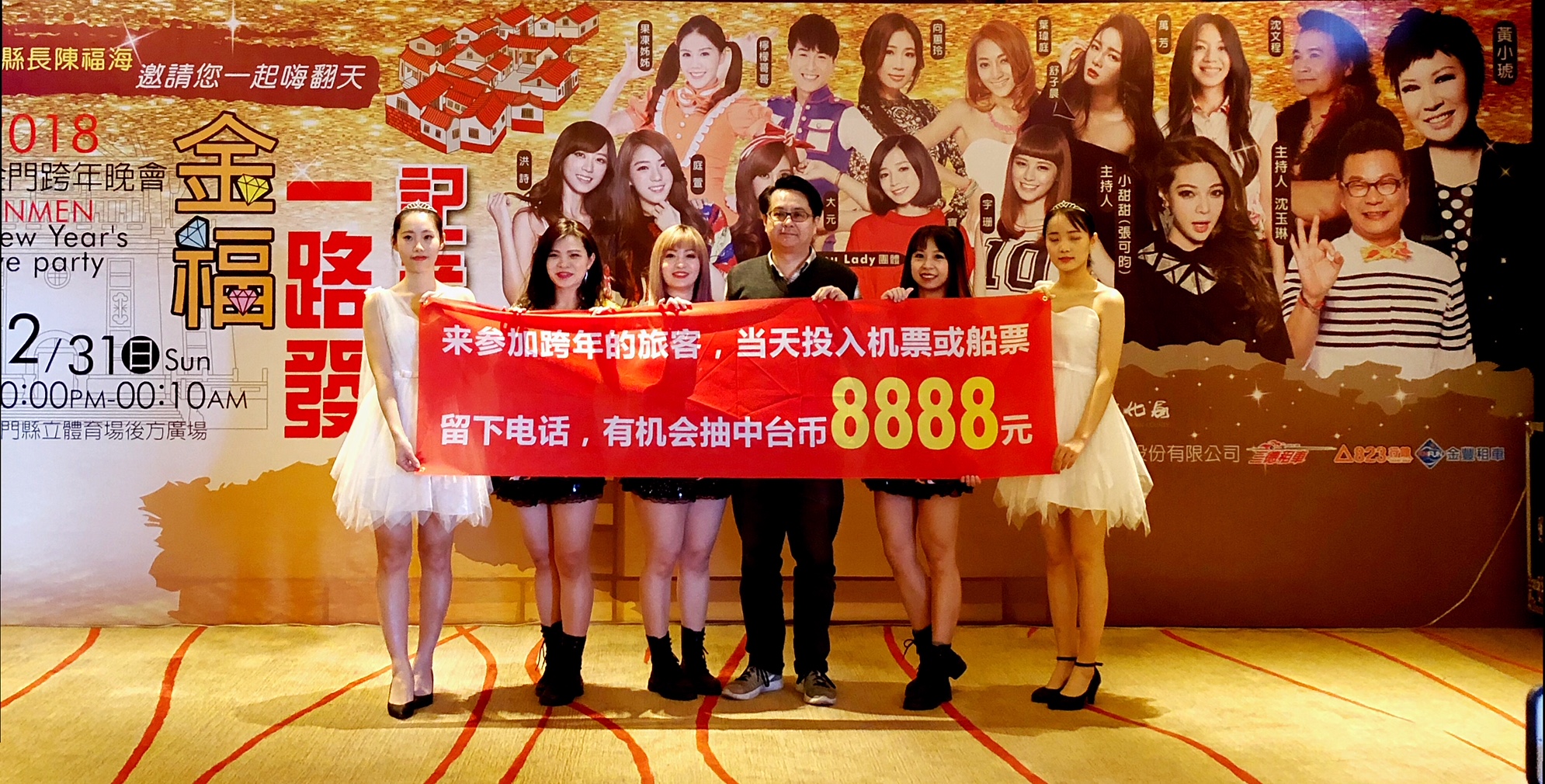 当天来现场参加晚会活动的朋友,除了有机会抽中电动车、IPHONE 8手机、空气清净机、平板电脑等多项好礼之外,凡是从外地搭船或飞机来到金门县跨年的游客,凭机票或船票,在上面注明自己的电话以及姓名,有机会可抽得台币8888元的大奖。