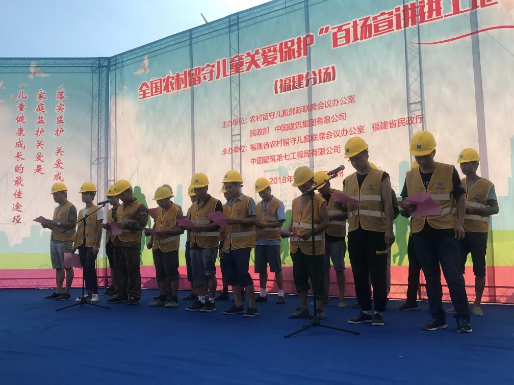 “百场宣讲进工地”活动将在中建集团承建的100个在建项目工地举行,在全国31个省(自治区、直辖市)设立分会场,本次活动作为福建省首场也是唯一一场,也是福建省农村留守儿童关爱保护“送政策”、“传技能”进工地、近外出务工人员的专项活动。