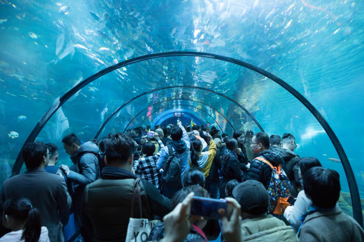 從生態雨林出來,不遠處便是鯊魚王國,裡面有45塊大小不同的亞克力觀景窗,住著300餘種、近30000尾海洋動物。隔著透明的視窗,海裡世界的魚兒們自由游翔,仿佛與人世無關,隱約處還能聽到來自海底的問候:“歡迎來到我們的家園!”根據工作人員介紹,這個巨幕是鯊魚王國裡最大的觀景窗,也是目前世界最大的亞克力觀景窗。