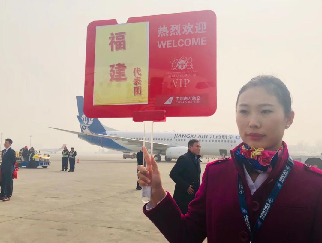 工作人員舉牌歡迎出席十二屆全國人大五次會議的在閩全國人大代表