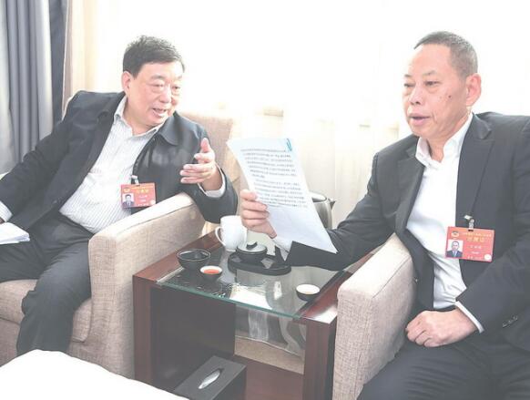 住閩全國政協委員呂培榕(右)與住閩全國政協委員吳志明在駐地對提案展開討論