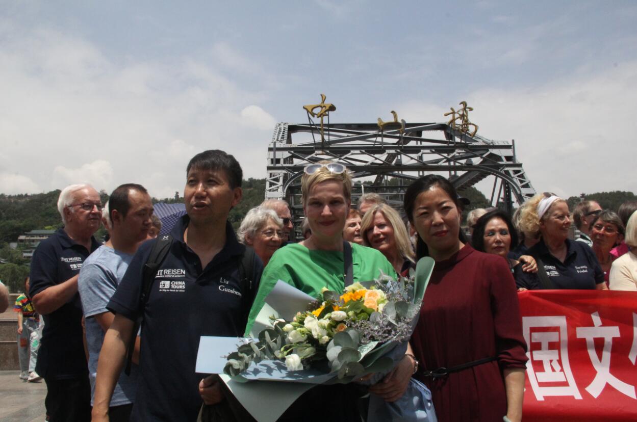 蘭州市文化和旅遊局副局長金小平(前排右一)向德國《時代》周報總裁桑德拉·克拉夫特(前排中)獻花歡迎