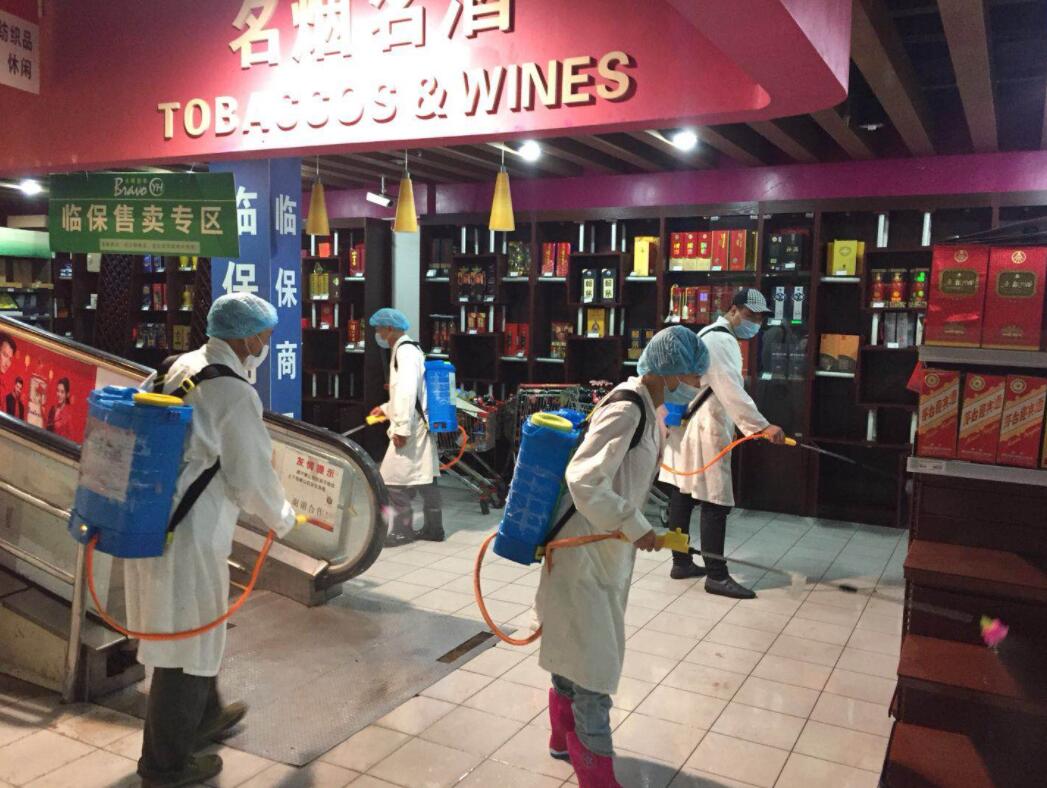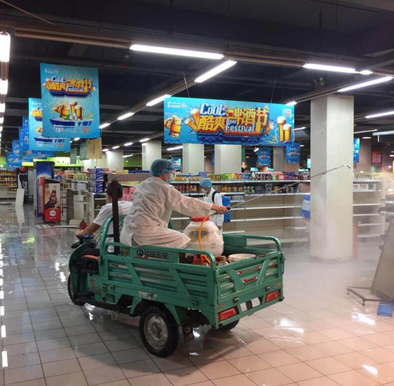7日,縣科盛有害生物防治有限公司員工在永輝超市(松溪店)開展災後環境應急消殺工作