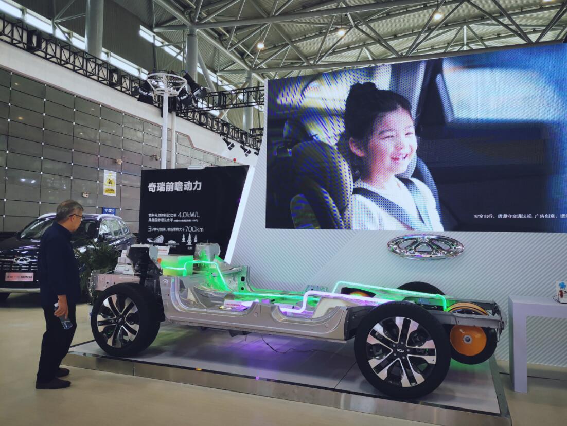 在展區內,奇瑞展示有多款產品,包括最大續航里程超過700公里的第三代氫燃料電池車、奇瑞新能源純電動SUV瑞虎e、EXEED星途 E-IUV概念車等。