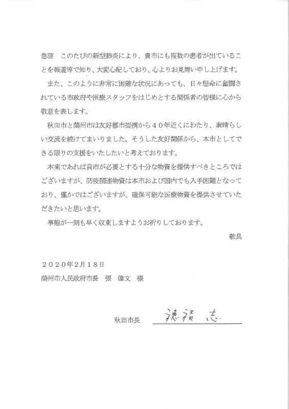 “頃聞新型冠狀病毒疫情來勢洶洶,蘭州市也出現了數名新冠肺炎患者,對此我十分擔心,謹向貴市致以深切的慰問。在此困難時刻,謹向日夜奮戰在防疫一線的蘭州市政府各位同仁及醫護人員致以由衷的敬意。”秋田市市長穗積志在給蘭州市的來信中表達了對友城蘭州的挂念,對防疫工作的支持,以及對醫護工作者的祝福,並表示願協助蘭州市共戰疫情,祈願疫情早日得到控制。