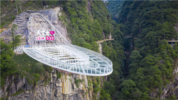 新建設的玻璃觀景台——「天空之心」,站在上面可俯瞰岱仙瀑布全景,有「人在空中走,景在腳下游」的美妙體驗。觀景台懸空高度達314米,外挑懸空長度約52米,總面積520平方米,組合成數字「1314520」,象徵「一生一世我愛你」。