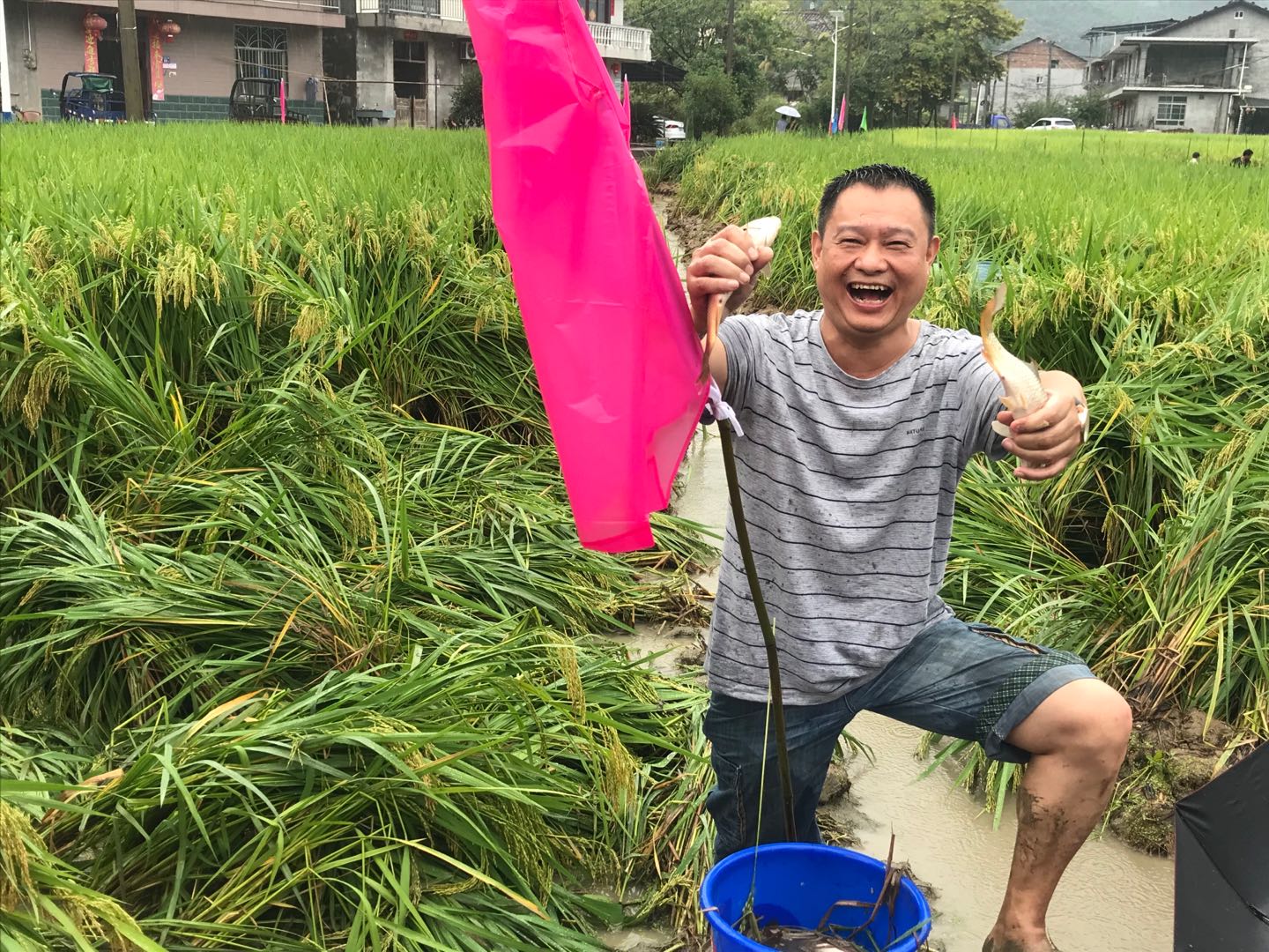 這邊是在割稻子比賽,另一邊同時進行的是抓魚比賽,幾十個農村叔伯阿姨大哥大姐挽起手袖、褲腳,冒著小雨在水田間來回穿梭奔跑,雙手快速在泥水裡抓來摸去。“抓到了!抓到了!”隨著一聲聲歡快的尖叫,“劈劈啪啪”一隻只稻花魚被相繼抓起,扔進小水桶裡。