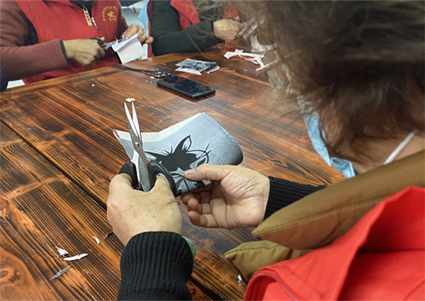 大家隨著艾林老師的步驟操作,認真仔細地操作著剪刀,逐漸熟練起來,一張張普通的紅紙巧妙的變成了栩栩如生的剪紙作品。“一開始感覺有點難,剪著剪著就覺得不難了,越前越熟練了。”居民陳雪安邊剪邊告訴記者。