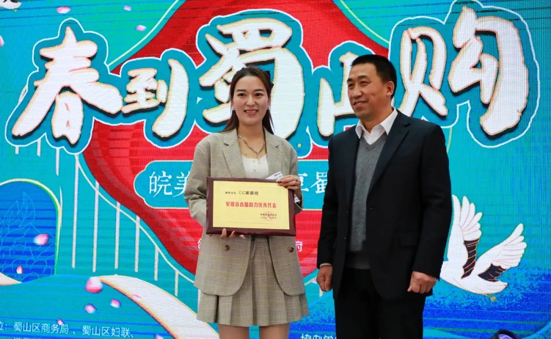 現場,安徽省商務廳領導為謙尋主播頒發「安徽省直播助力優秀代表」榮譽證書,合肥市婦聯領導為個體創業者劉寧頒發蜀山區「三八紅旗手」,美團平台代表介紹「本地生活社區團購電商」發展,與會領導共同開啟「春到蜀山購」完美畫卷。