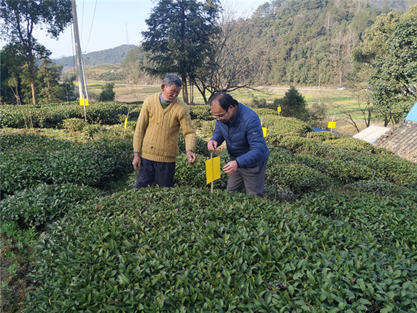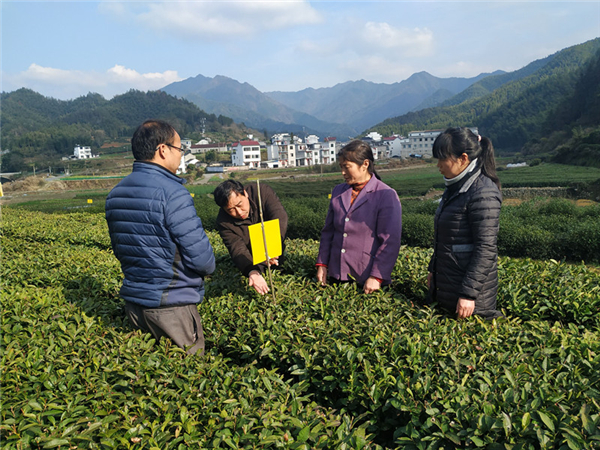 3月10日,在安徽黄山市休寧縣榆村鄉各村組茶園地裏,村民們抓緊在自家茶園扡插粘蟲黃板,一派忙碌的春管景象。