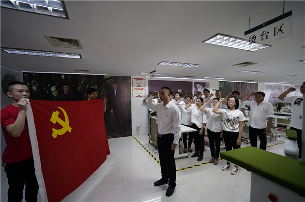 據悉,6月17日,福建晉江市金井鎮的10多位新黨員在福建七匹狼服裝製造有限公司的黨建示範「紅色車間」(樣衣車間)進行入黨宣誓。