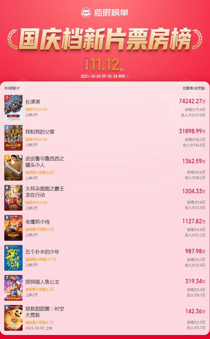 貓眼專業版App數據顯示,截至發稿,2021國慶檔「新片」總票房(含預售)已破11億!其中,《長津湖》票房已破7億,以絕對優勢領跑,《我和我的父輩》票房已破3億。