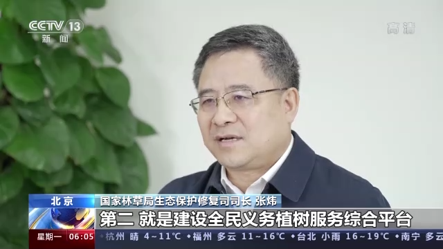 國家林草局生態保護修復司司長 張煒:建設全民義務植樹服務綜合平台,豐富我們現在的各種盡責的形式,通過網絡推出一批義務植樹盡責的項目,方便群眾就近盡責,多樣盡責。