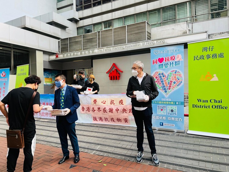 灣仔民政事務處今日則聯同抗疫連線在灣仔向市民派發快速測試套裝。抗疫連線亦會透過區內地區團體、業主立案法團及互助委員會,向灣仔區有需要的居民派發快速測試套裝,供他們作檢測。