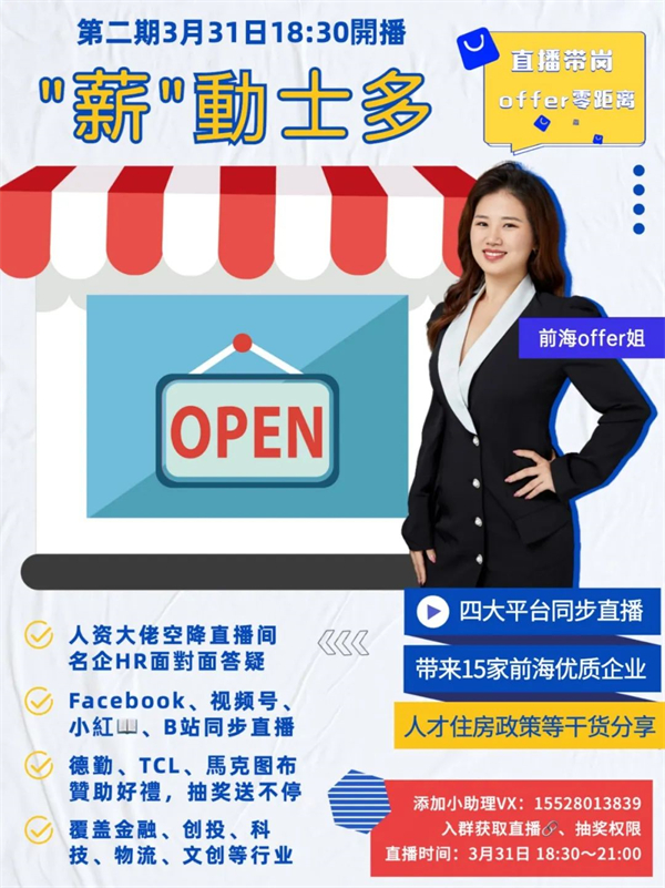 據悉,「薪動士多」店面不大,來頭不小。依託於「前海港澳青年招聘計劃」的影響力和過往輸送生源打下的良好基礎,此次面向港澳青年的直播合作邀請一發出,前海優質企業紛紛參與。活動吸引德勤、TCL實業、泰康國際醫院、HAYS等前海企業深度參與,職位涵蓋金融、科技、手機、物流、地產、設計等熱門行業,相關企業高管及HR負責人詳細介紹企業戰略、工作環境、薪酬福利、文化氛圍、發展前景,並與求職青年在線互動。