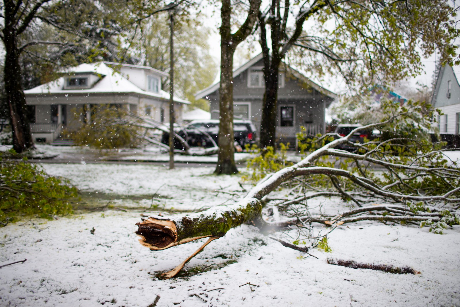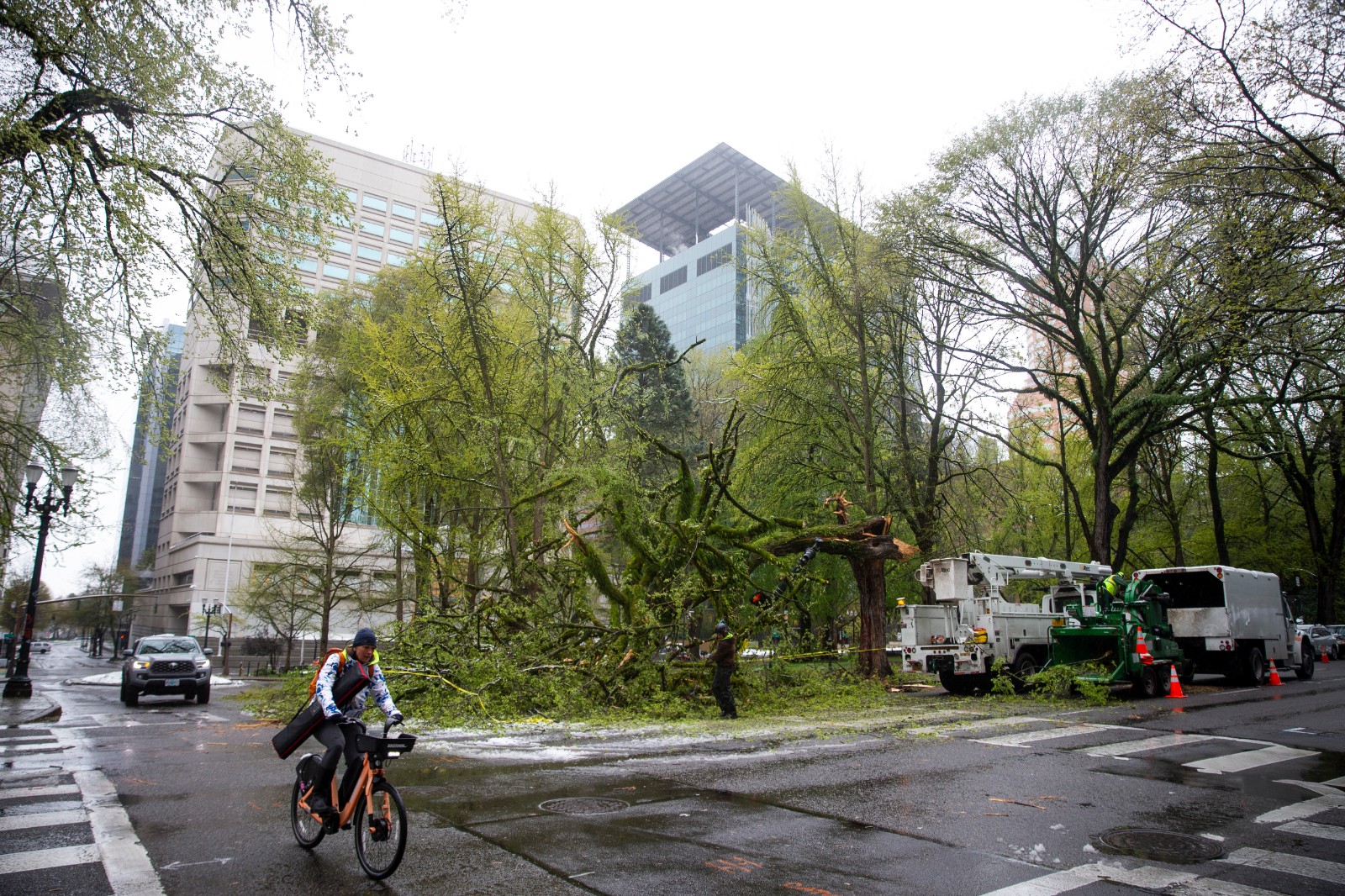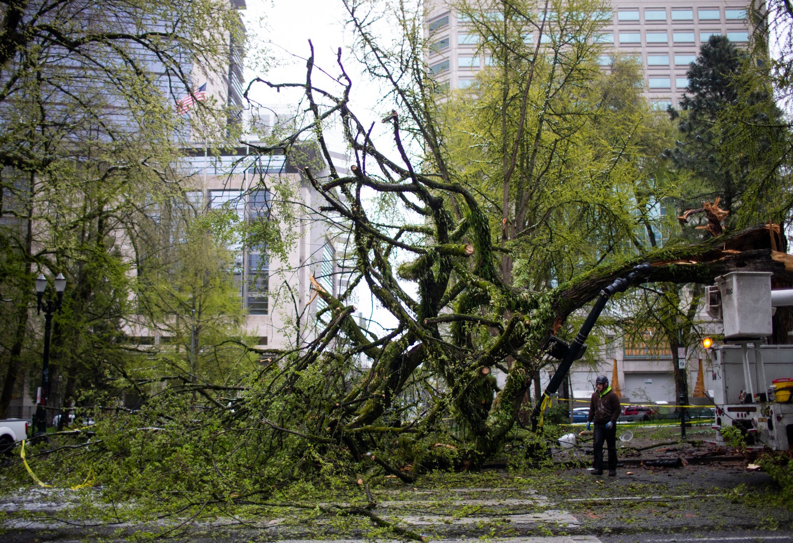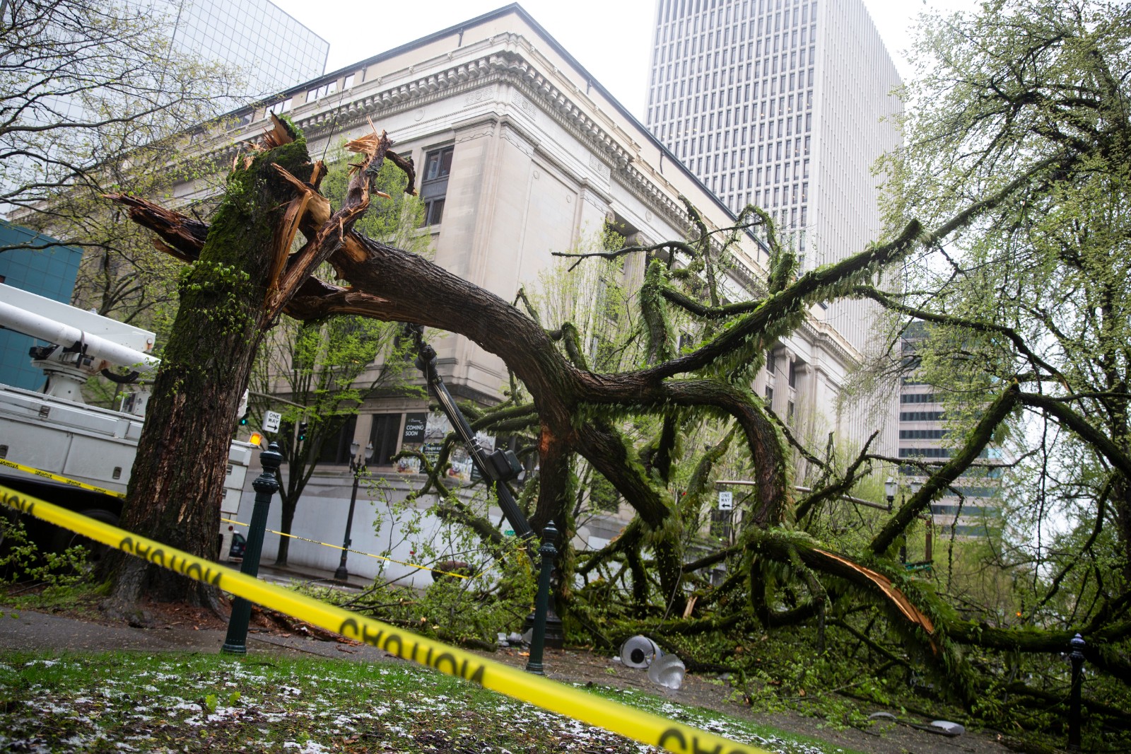 美國俄勒岡州近日遭遇降雪天氣。這是4月11日在美國俄勒岡州波特蘭拍攝的被雪壓塌的樹木。(新華社/美聯)