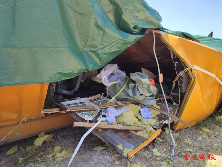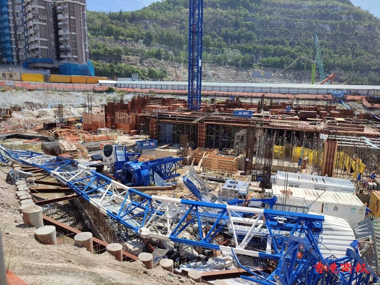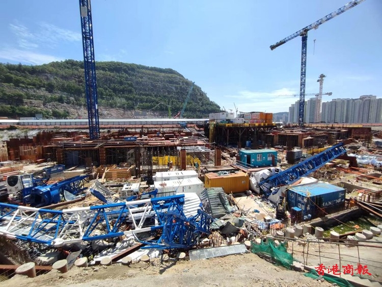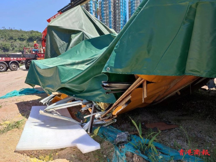 意外中被倒塌天秤壓毀的兩個貨櫃改裝的辦公室,已由吊臂吊離現場放在路邊,兩個貨櫃均嚴重塌毀,支架扭曲,雜物倒塌櫃內,至於塌下的天秤仍然橫臥地盤內,工人用帆布蓋上,待稍後交由警方搜證。