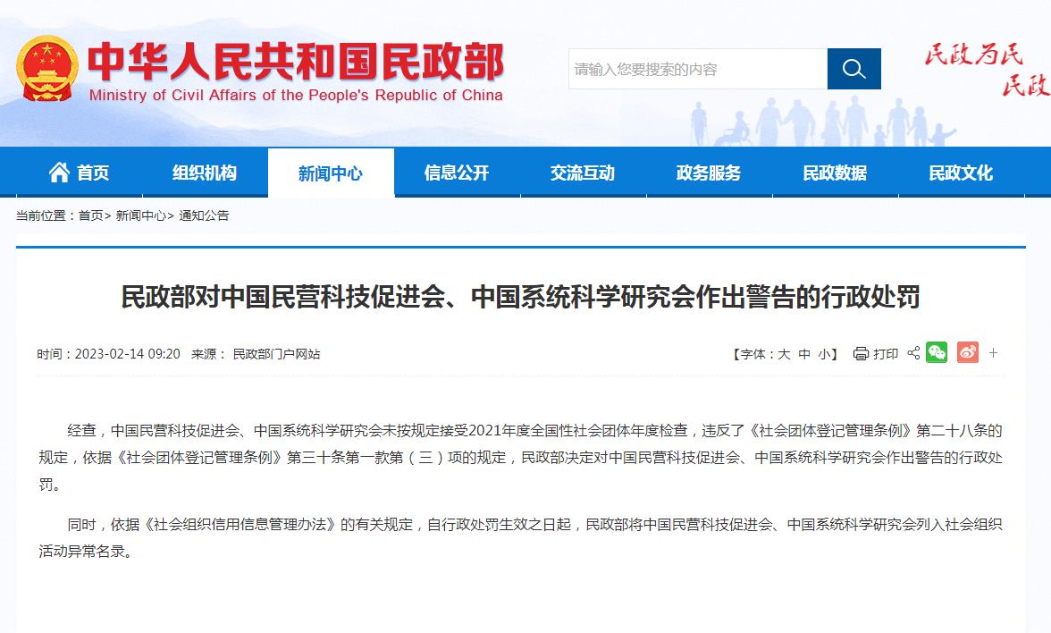 同時,依據《社會組織信用信息管理辦法》的有關規定,自行政處罰生效之日起,民政部將中國民營科技促進會、中國系統科學研究會列入社會組織活動異常名錄。