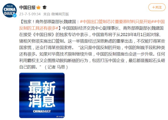 中國國際經濟交流中心副理事長、商務部原副部長魏建國在接受《中國日報》的獨家專訪中表示,中國宣布將於從2023年8月1日起對鎵、鍺相關物項實施出口管制。這一舉措是經過深思熟慮的重拳出擊,不僅能打得某些國家慌,還會打得某些國家疼。「這只是中國反制的開始,中國的制裁手段和種類還有很多。如果對華高技術限制繼續升級,中國的反制措施也會進一步升級。任何利用霸權主義企圖推動脫鈎斷鏈的行為,包括打壓中國企業,最後都是搬起石頭砸自己的腳。」