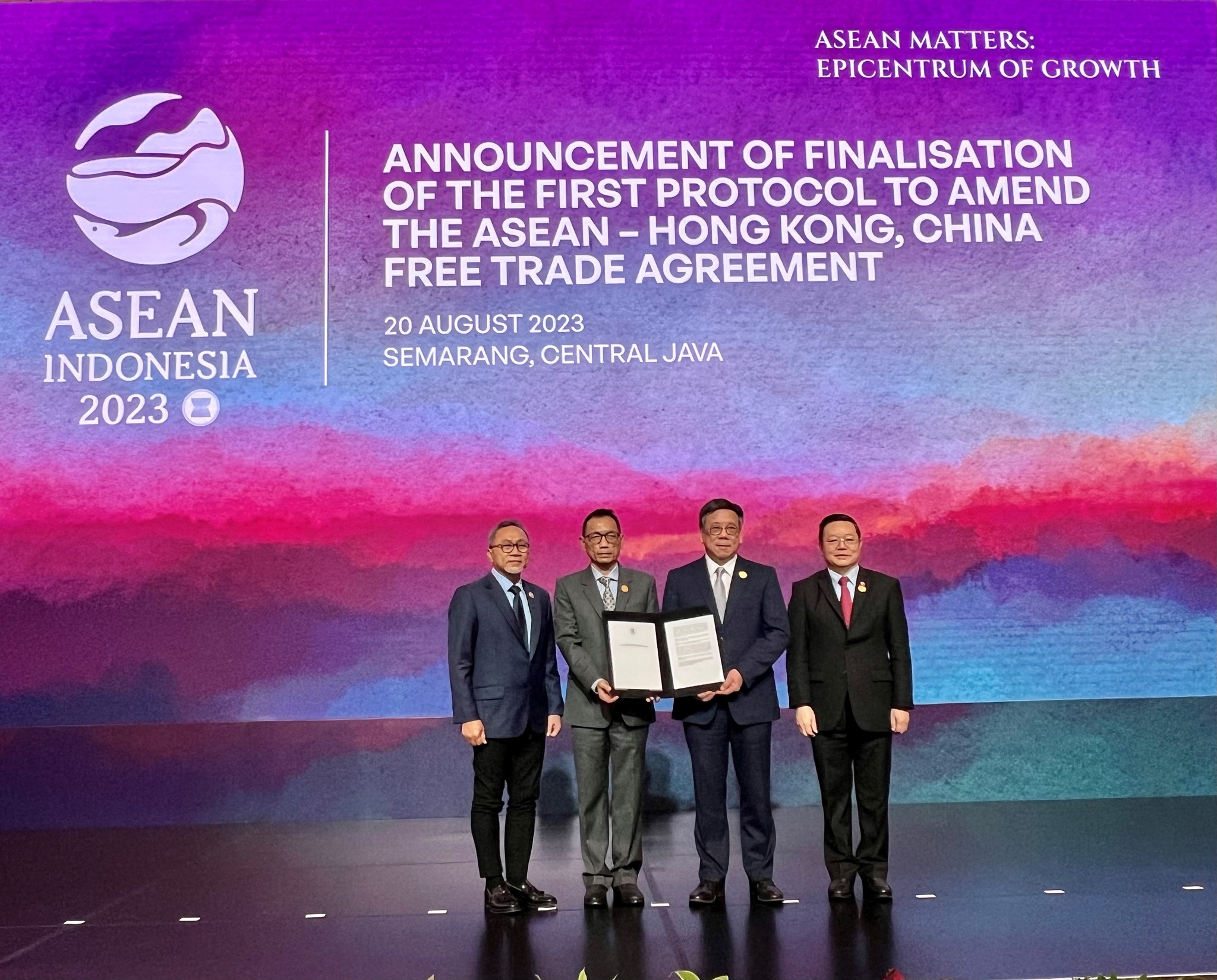 他指出,雖然區域及環球經濟面對不少挑戰,但透過合作可減低影響。香港與東盟《自由貿易協定》及《投資協定》的成功落實,以及行政長官最近率團訪問東盟國家期間簽訂的33份合作備忘錄和協議,足證香港與東盟的多方面合作。