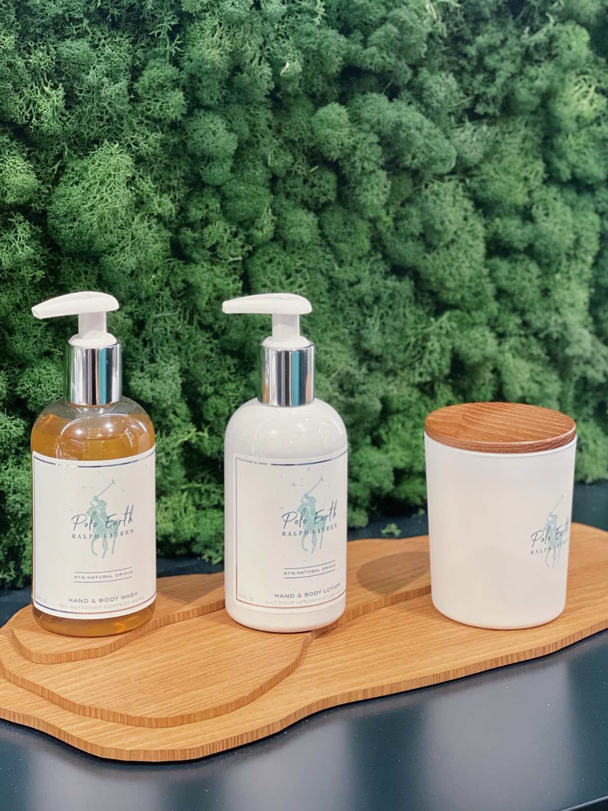店舖裝潢以馬鞍皮革與拋光木材的搭配,在皇家海軍藍的色調中,顯得和諧且富有層次;富現代感的金色和銅色擺設作點綴,整體氛圍優雅。店內展示了多款香水系列、沐浴和身體護理產品,包括經典的Polo、Polo Blue、Polo Black、Polo Red和Ralph Lauren Romance,還有時尚的Ralph’s Club和最新推出、環保的Polo Earth。