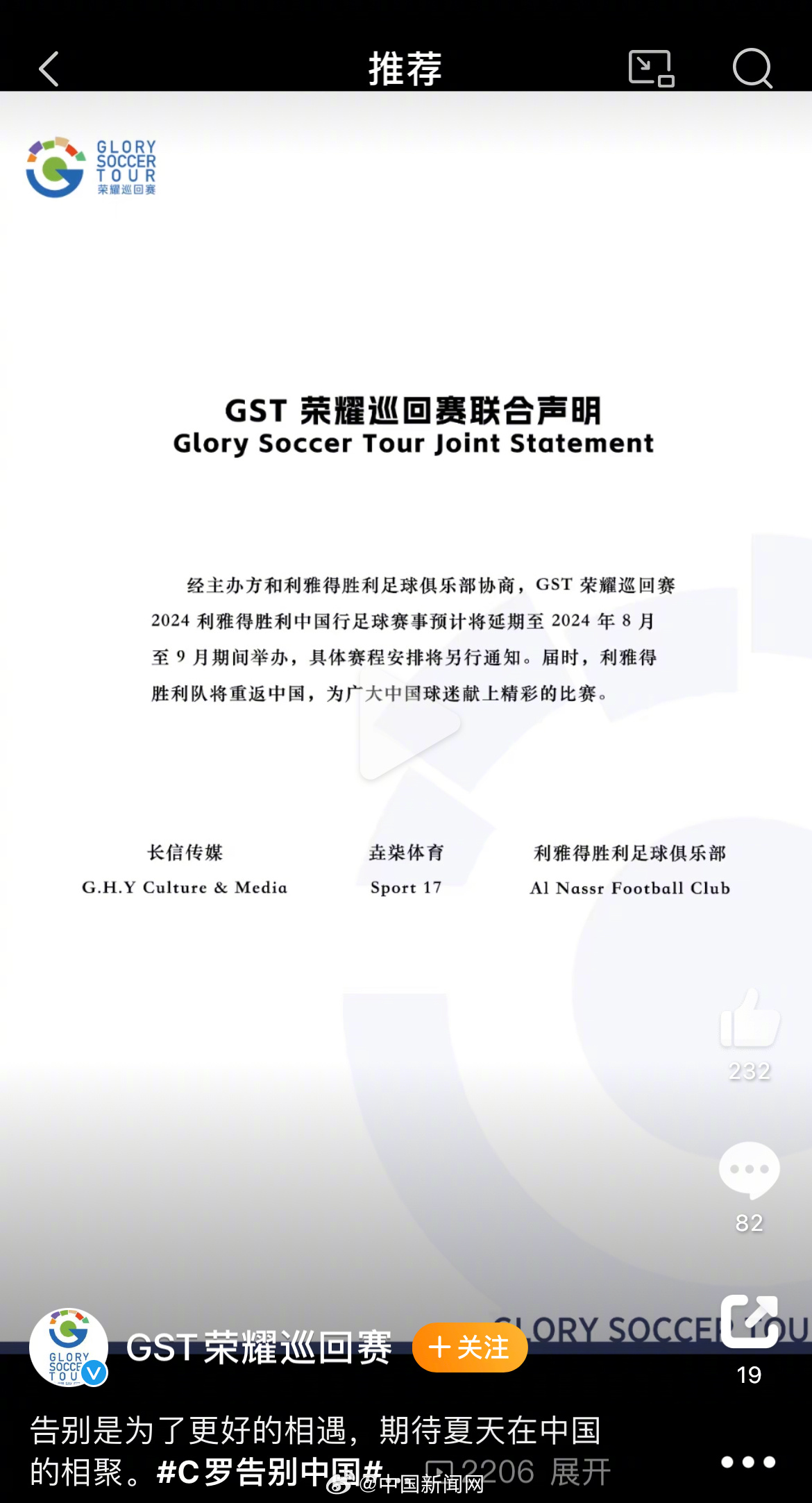 1月26日,C羅中國行主辦方發布聲明稱,經主辦方和利雅得勝利俱樂部協商,利雅得勝利中國行足球賽事預計將延期至2024年8月至9月舉辦,具體賽程安排將另行通知。屆時,利雅得勝利隊將重返中國,為廣大中國球迷獻上精彩的比賽。