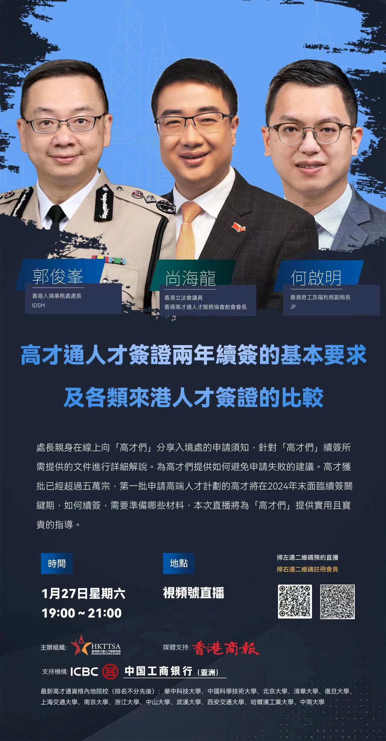 本周六晚上7點,香港入境事務處處長郭俊峯、香港勞工及福利局副局長何啟明、香港高才通人才服務協會創會會長尚海龍會解答高才通最關心的續簽問題,香港商報的微博、視頻號、app 、Facebook及 YouTube會同步直播,高才們不容錯過!(記者 木子 羅璇)
