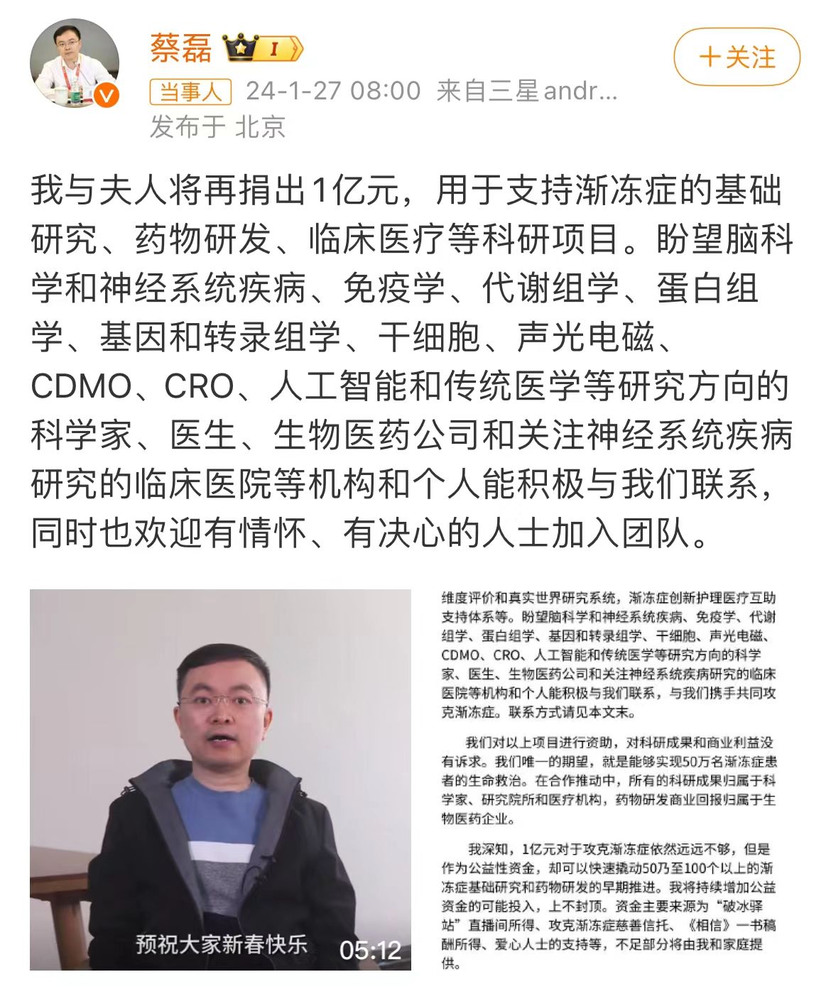 蔡磊稱,他對科研成果和商業利益沒有訴求,唯一期望是救治50萬名漸凍症患者的生命。他還將持續增加公益資金的可能投入,上不封頂,盼望相關研究方向的機構及個人能積極與團隊聯繫,同時也歡迎有情懷、有決心的人士加入團隊。(頂圖源自網絡)