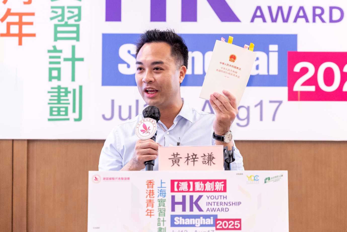 黃昕然代表資助機構致勉辭。他對港區婦聯多年來重視青年工作和積極支持青年實習計劃表示感謝。他希望各位香港青年能通過此次實習,為未來的事業發展打好基礎,並多到上海不同地方探索,看看國家的最新發展成果,把握國家迅速發展帶來的機遇。期待各位青年把上海當地的一些成功經驗帶回香港,共建香港美好家園。他亦介紹了民青局「『友』妳啟導」友師計劃、青年宿舍計劃、全港美好家庭選舉等最新政策,鼓勵青年朋友們積極參與。