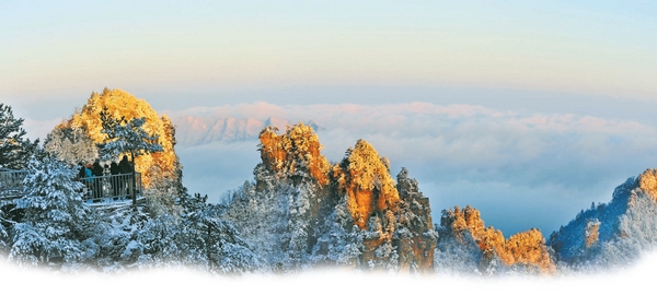 在張家界國家森林公園銀色世界里,金鞭巖以錚錚鐵骨般的挺立表現出一種雄性的力量,金鞭溪宛如少女般婉約而靈動。拾級登上袁家界,隻見低處白絮成堆,玉樹銀樓交輝,穿行在灌木叢中,便能攀扯出一枝枝美麗的珊瑚花!而登上氣勢雄偉的天子山,只見蒼茫大地一片潔白,映入眼簾的是一片冰天雪地,那雪皚皚的蒼茫壯闊令人心曠神怡!