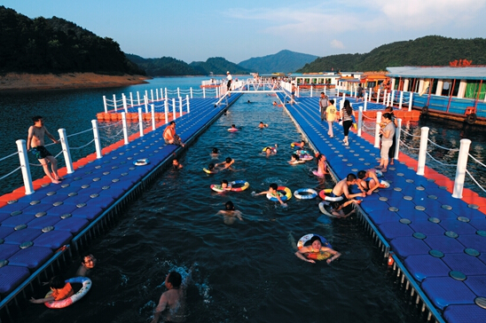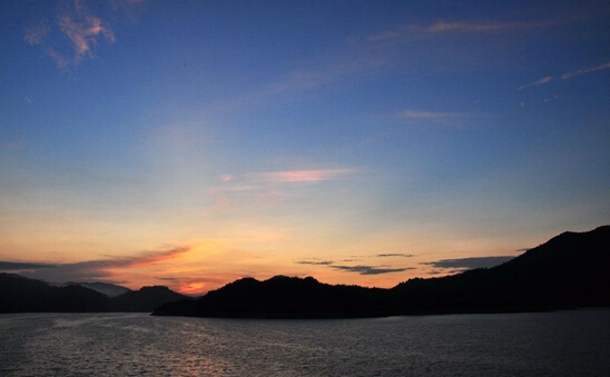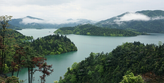 到游船泊于湖中島嶼時,改乘游船提供的一葉小舟,泛舟于湖上,兩岸山島迤邐如龍,天水共成一色,似入畫卷。縹碧湖水千丈見底、其綠如藍。青魚、銀魚、紅魚不時結伴游過,那搖頭曳尾恬然自在的風姿,使人幾乎忍不住想要投身其中,游戲其間。