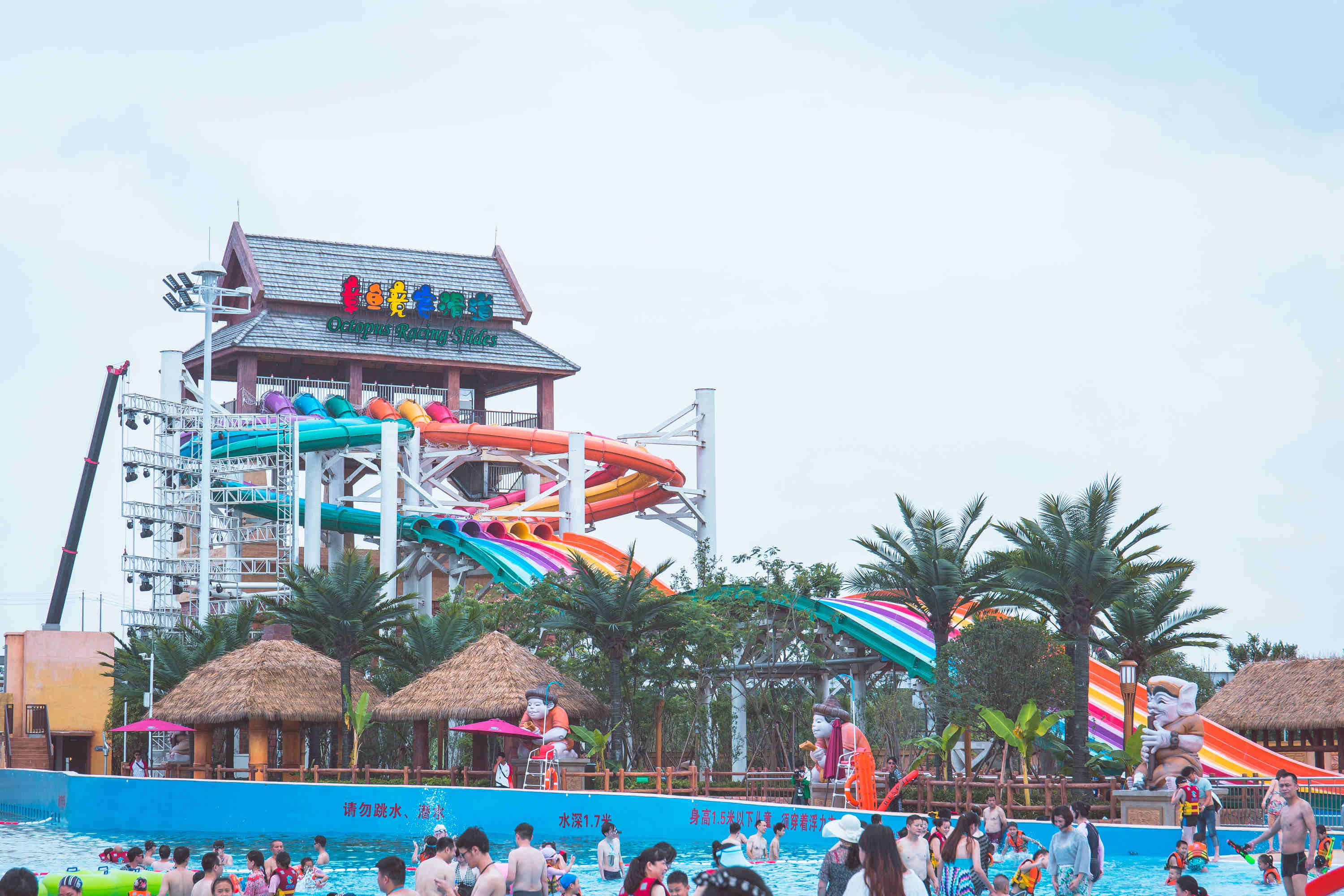 歡樂雪域的上方「屋頂」,就是歡樂水寨。歡樂水寨面積達8萬平方米,分為合家歡區、巨浪灣區和尖叫谷區(暫未開放)三大主題區域,集合了20餘項精品娛水設備,適合親子、情侶、學生等全客群遊客體驗。