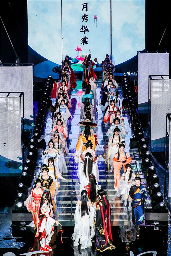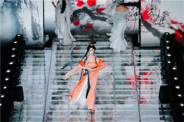 活動現場,張家界大峽谷玻璃橋在夜空中燈光璀璨,流光溢彩。國慶期間吸引超5萬遊客打卡的網紅景點大峽谷玻璃橋一夜之間秒變T台,六十餘名走秀者悉數登場,身著天衣華裳帶來了一場國風大秀,將夜晚的“雲天渡”襯托得美輪美奐。
