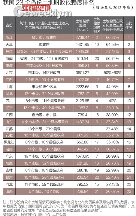 根据上述的省级政府审计部门的公开审计报告及其相关数据,《中国经济周刊》、中国经济研究院联合研究并发布“我国23个省份‘土地财政依赖度’排名报告”(下称《报告》)。